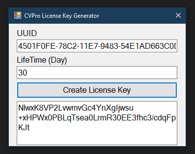 CVPro-Login-System A simple C# login system with license key using motherboard uuid verify and date diff function to create license key Features Demo Version UUID (MotherBoard) Verify Limited usage days Check Dnspy Hook (Credit to XenocodeRCE) ScreenShot CVPro Login CVKeygen