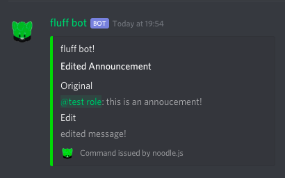 [on the announcement above]fluff, edit 123456789012345678 #annoucements edited message! - Returns: