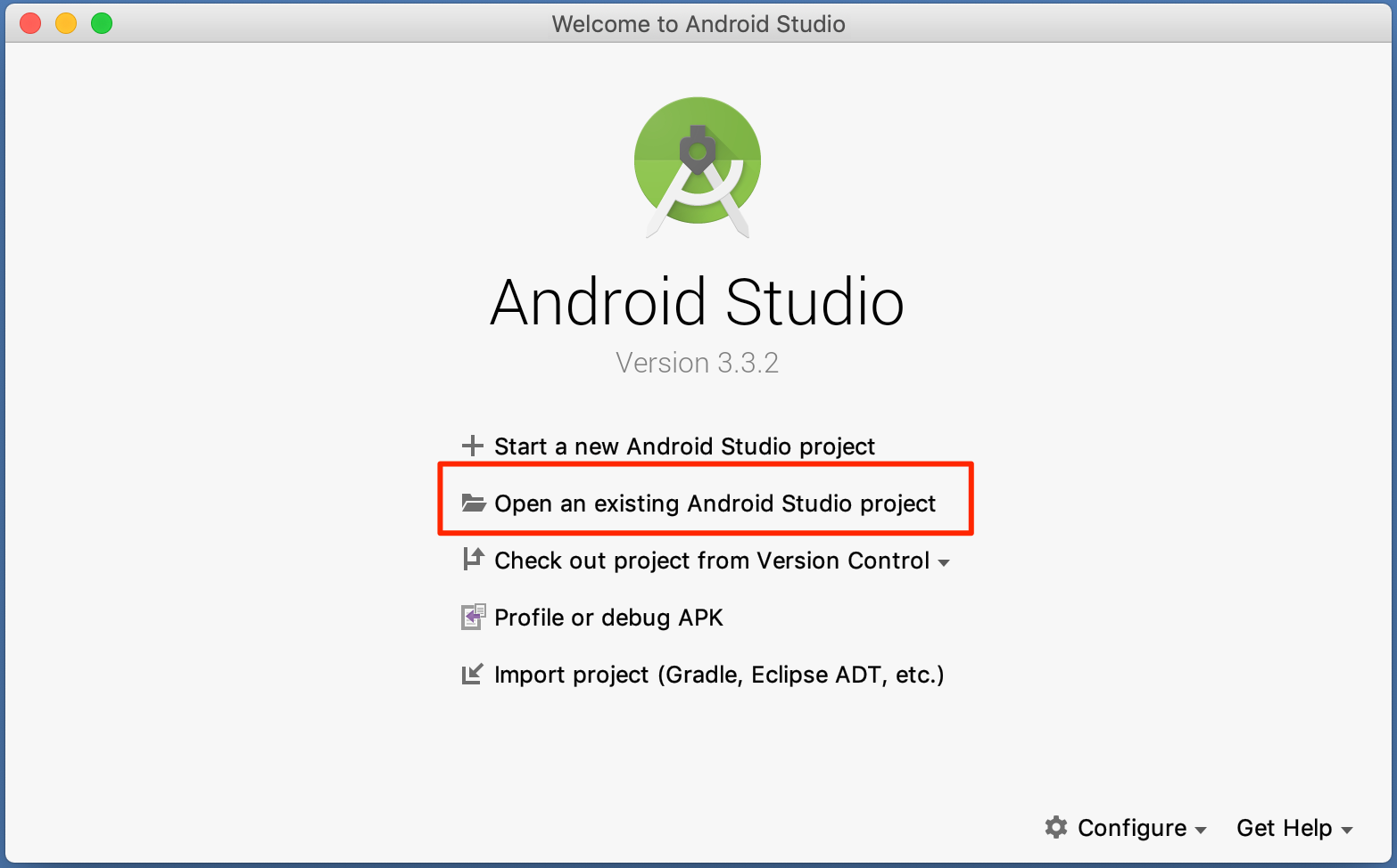 Quick Startの[Open an existing Android Studio project]を選択してください。