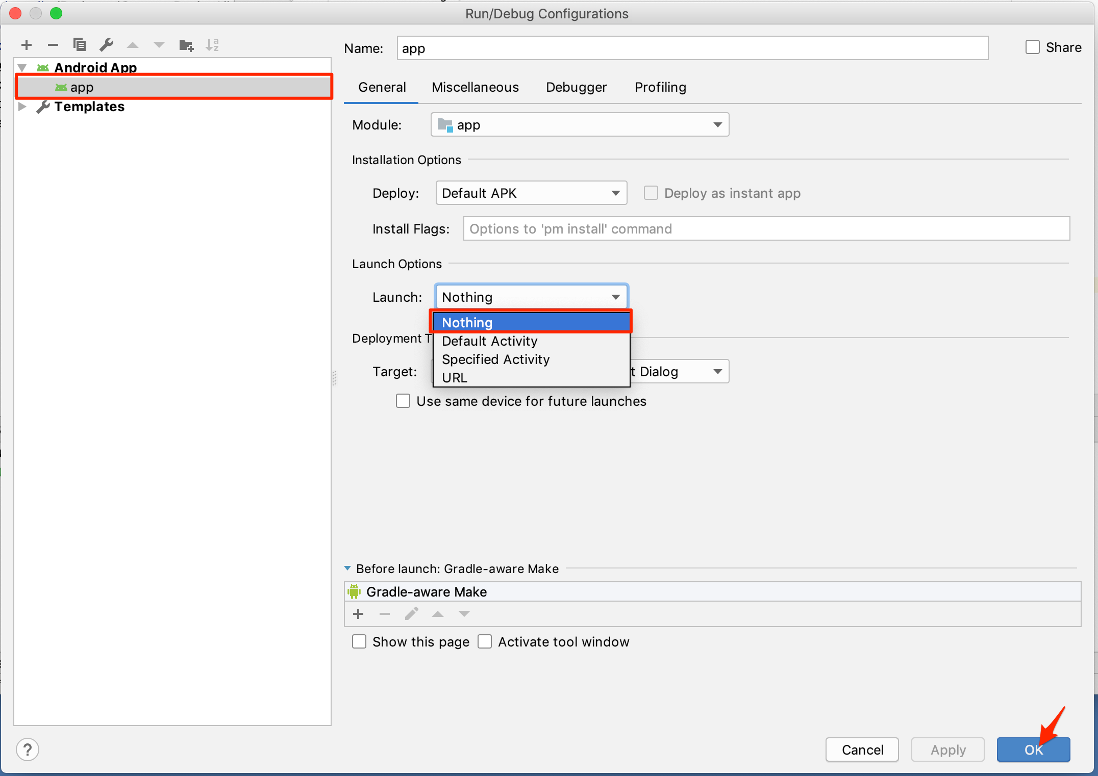 新しくウィンドウが出てきます。まず左側のAndroid App内のappを選択すると右側のような画面が出てきます。 そこで、[Do not launch Activity]を選択してOKを押してください。