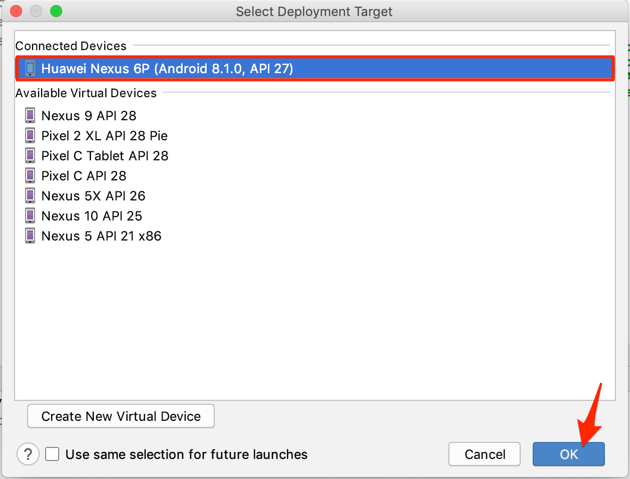 その後、このような画面が出てくるので、[Choose a running device]にチェックを入れて、インストールしたい端末を選んでOKをクリックしてください。