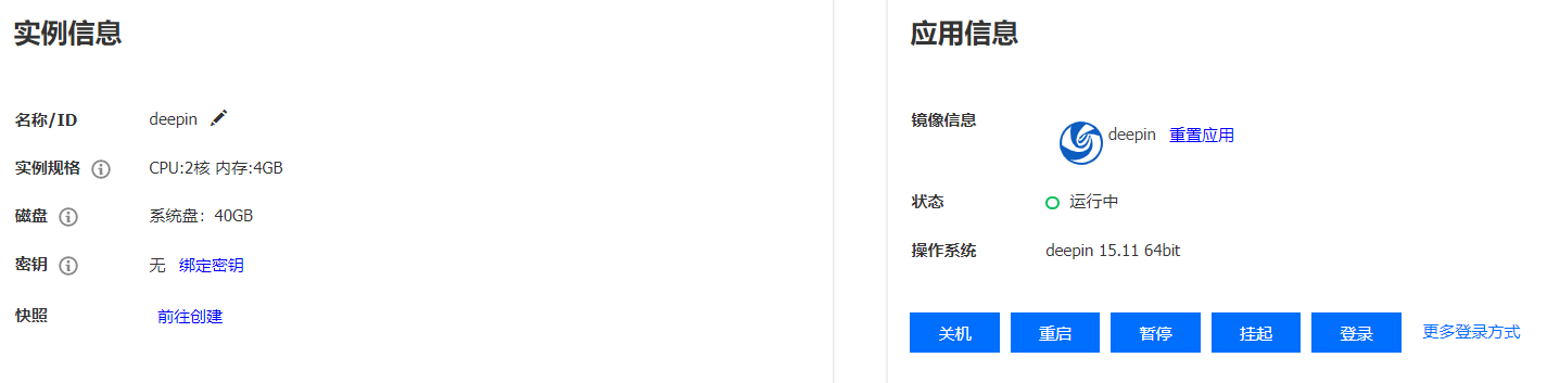 在此界面可以对云主机进行远程连接使用,关机、重启、挂起、暂停等操作。点击登录后使用默认的novnc进行登录云桌面。