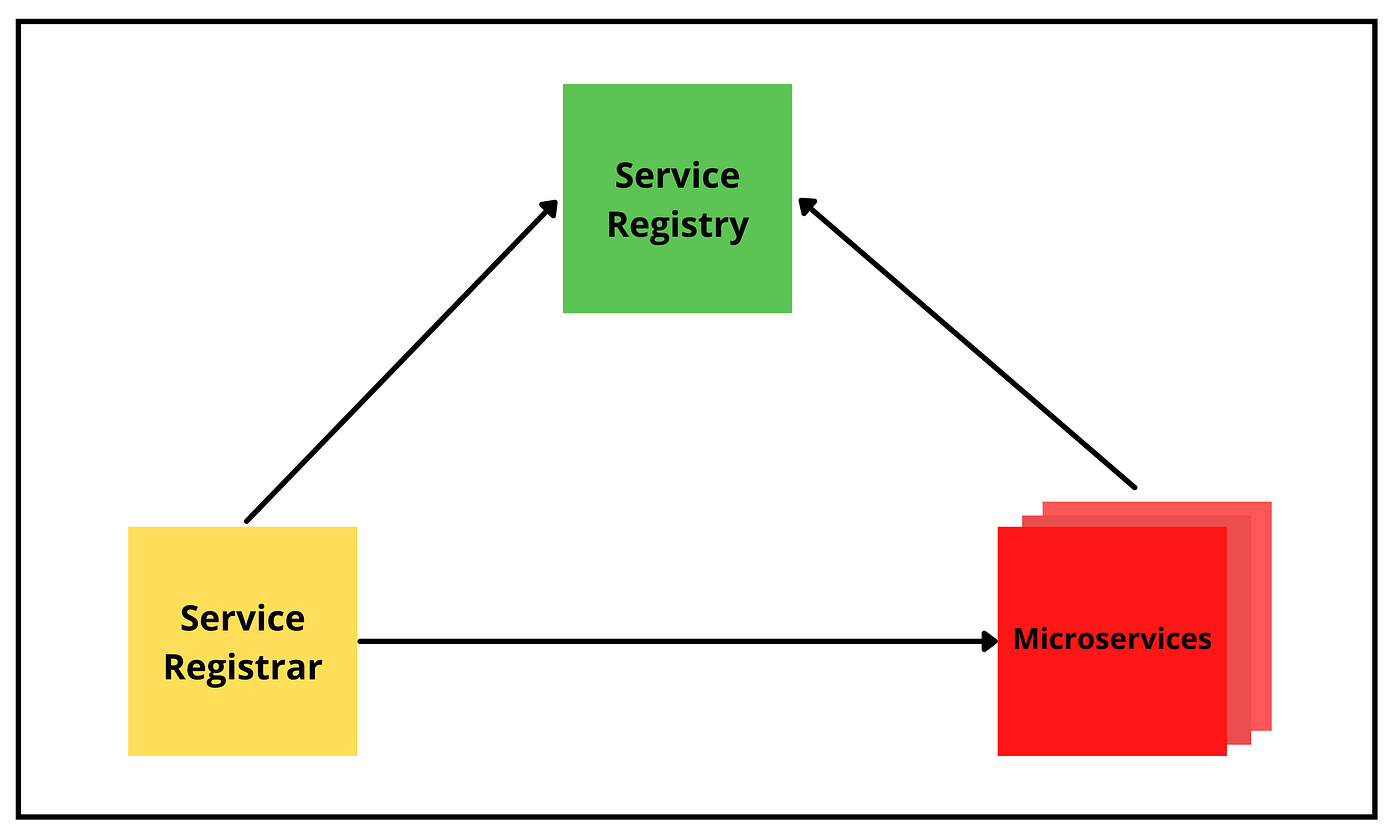 The diagram illustrates how services dynamically register and discover each other through the Eureka Discovery Server.