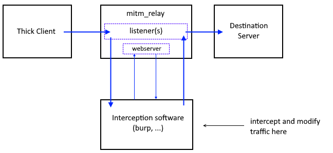 This script is a very simple, quick and easy way to MiTM any arbitrary protocol through existing traffic interception software such as Burp Proxy or Proxenet. It can be particularly useful for thick clients security assessments. It saves you from the pain of having to configure specific setup to intercept exotic protocols, or protocols that can't be easily intercepted. TCP and UDP are supported.