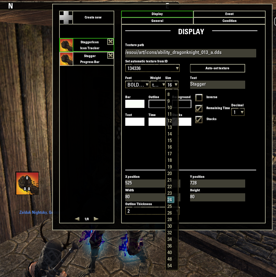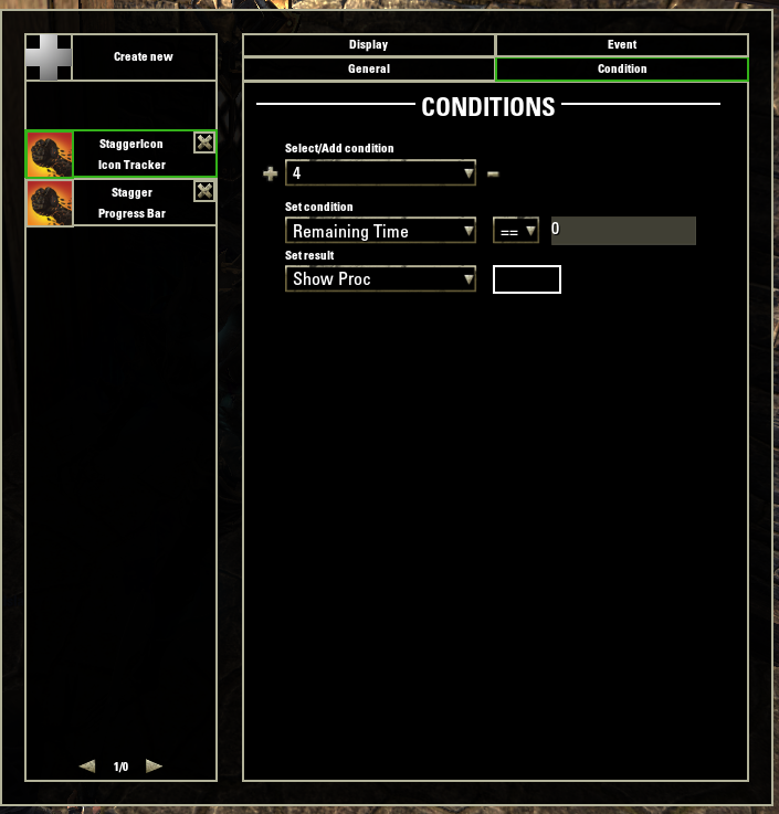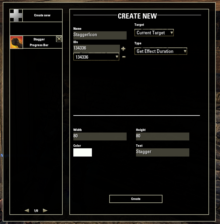Fill in the information, give the tracker a name, add ID to track, set the target as "Current Target" and type as "Get Effect Duration" or "Get Effect Duration only your cast" if you want it to only track Stagger applied by you, set height, width, color and displayed text
