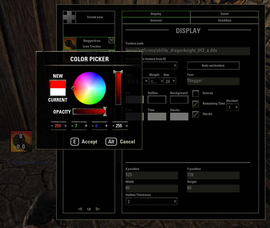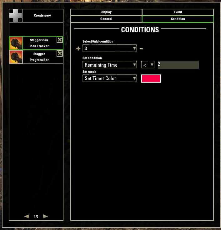 We'll make it so the tracker has different color based on amount of Stagger stacks applied, changes timer color to red when the effect has less than 2 seconds remaining, and glows when there are no stacks applied