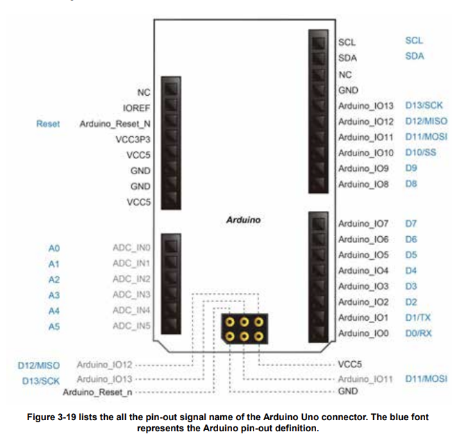 Diagram left shows how the FPGA maps to Arduino pins, the important ones are the ones with blue labels. Diagram right provided by Ed Stott shows how the ESP32 maps to the Arduino adaptor board which connects directly to the FPGA
