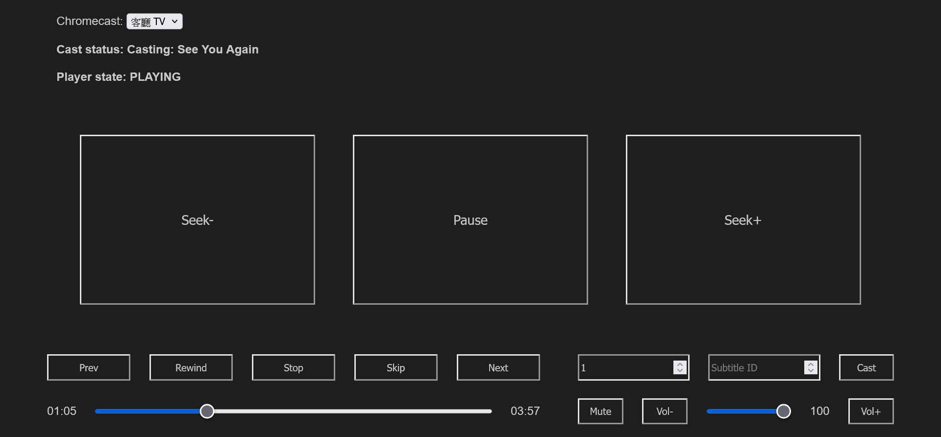 A simple Python server with web UI to control Chromecast, play local media files via Chromecast.