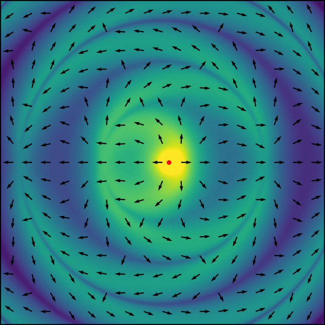 This example shows how to simulate an oscillating charge using PyCharge, computing and visualizing the scalar potential along the x-y axis at z=0 and t=0: