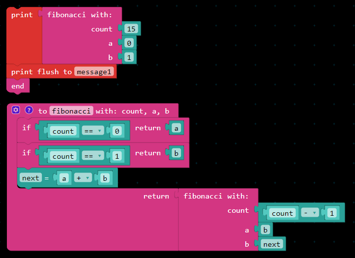 endblock at the end of your program, the functions will run after your code runs. - Recursion only works if you place the recursive function call in the return statement of the function. (See below)