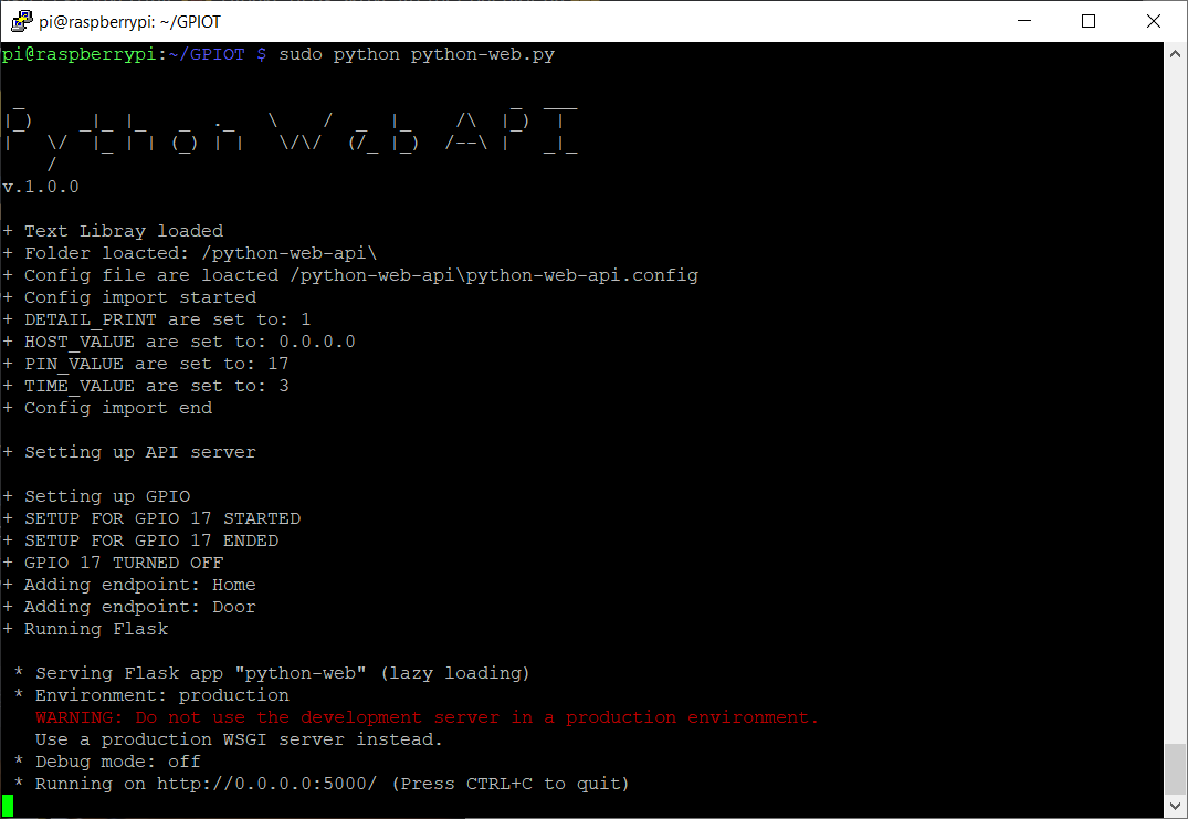sudo python python-api.pyInstall a new Device Handler in Smartthings using the code found in Smartthings Device Handler switch_device_handler_smartthings.groovy. Add a new device and use WEB Service Switch as the device type. Do all this from samsungs web portal.