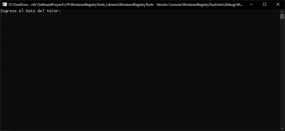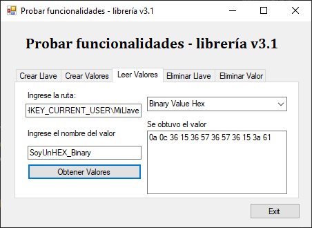 Console.WriteLine(registro.CreateKeyValue_String(path, keyName, valueData));Los valores que usted ingresará deben ser decimales tipo bytes, separando individualmente los datos mediante una ','