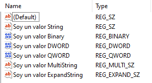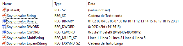 Console.WriteLine(registro.CreateKey(path, keyName));Los registros de Windows nos permite poder crear Valores con distintos tipos de datos según lo necesitemos. Estos son los tipos de datos que aceptan el registro de Windows (Regedit)