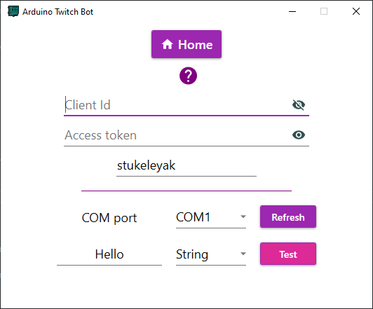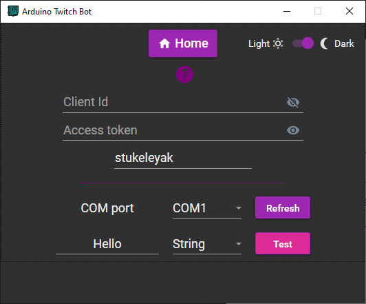 - Paste Client Id and Access Token in the respective TextBoxes in the Settings tab. Enter your Twitch channel's username. Select your desired COM port from the list below.