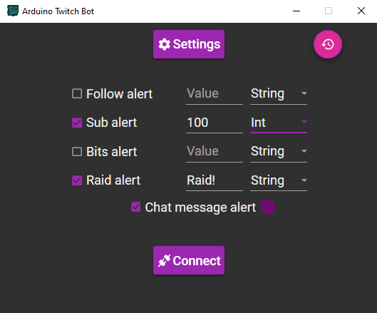 The bot connects to a Twitch user's chat and listens to events (such as: follows, subs, bits, raids and chat messages). Whenever an event occurs, a signal is sent over to an Arduino using a serial port.