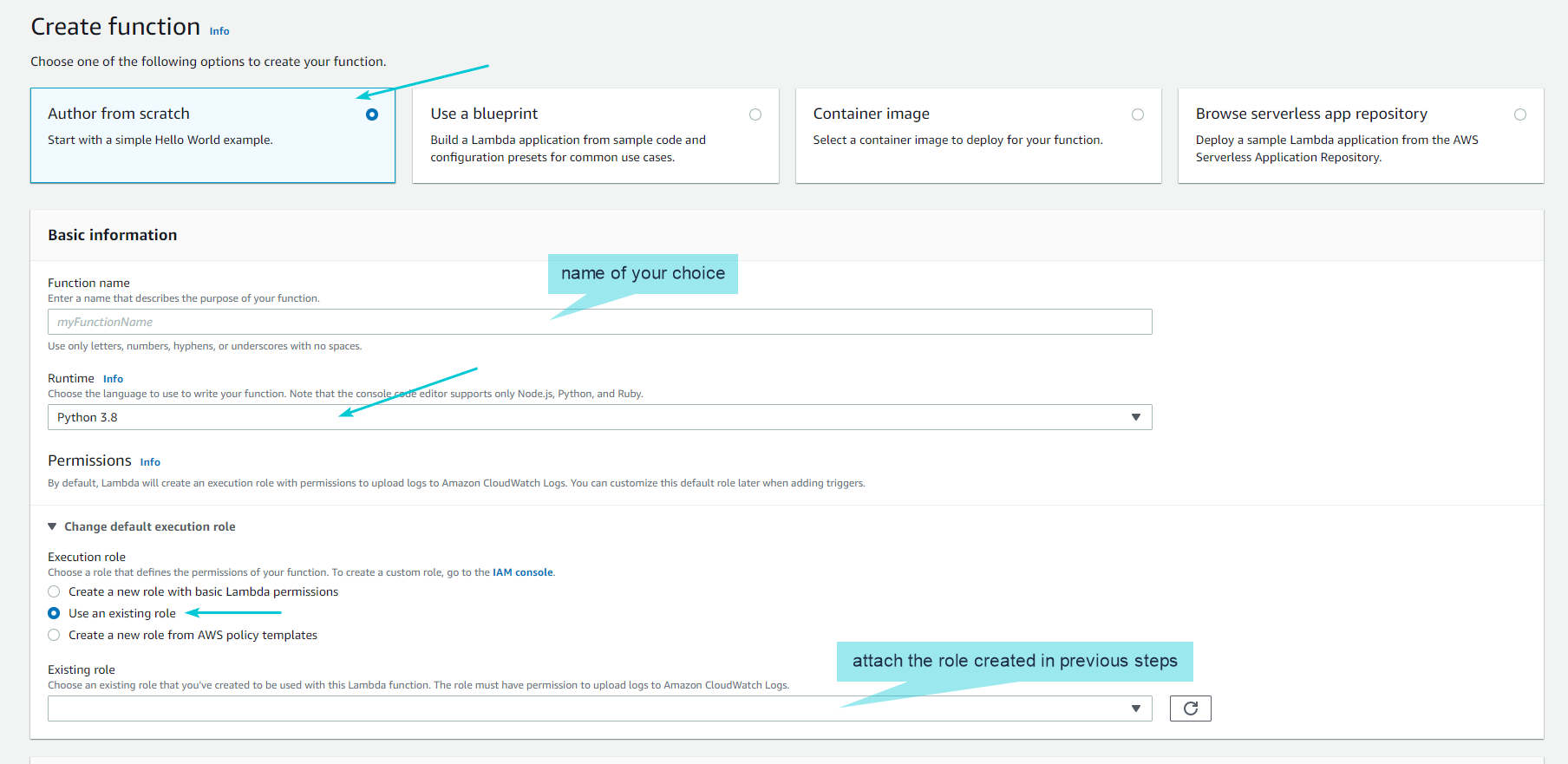 Select "Author from Scratch", name the function, chose Python 3.8 as Runtime, for Execution Role select the Role you created in Point B.iii.5 and click on "Create Function"