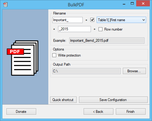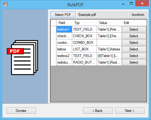 BulkPDF is a free and easy to use freeware software (Open Source), which allows to automatically fill an existing PDF form with different values. Only a spreadsheet (Microsoft Excel 2007/2010/2013, LibreOffice or OpenOffice Calc) with the desired values is required. BulkPDF.de