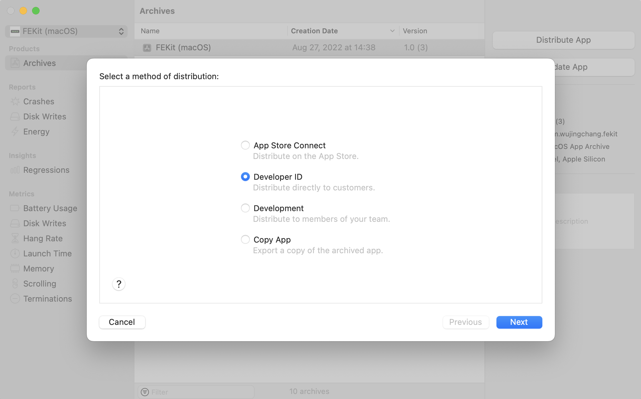接着,不同于之前分发 App Store,我们需要选择 Developer ID,它表示的是在 App Store 之外分发 App: