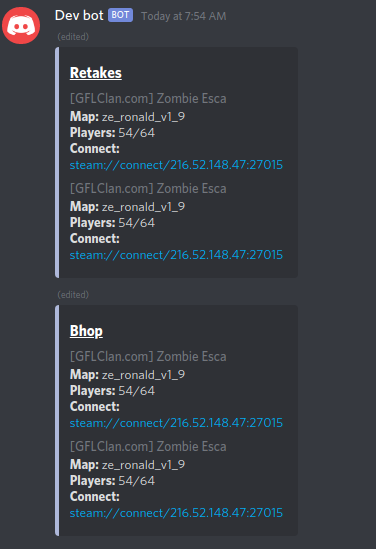 This discord bot can edit multiple messages for multiple source servers containing game details, e.g. player count, map and server name. This allows you to create separate messages for different gamemodes etc.