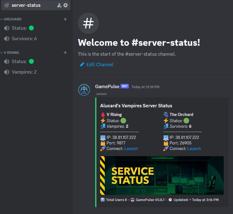 GamePulse uses Python-A2S to Query Steam Game Servers and updates Voice Channels based on their status. If you want a simple bot that will display Game Server Status info at a glance, check this out!