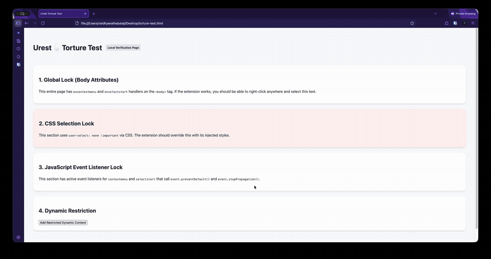 URest restores native browser controls on sites that block right-click, copy, or text selection, while aiming to keep page behavior intact.