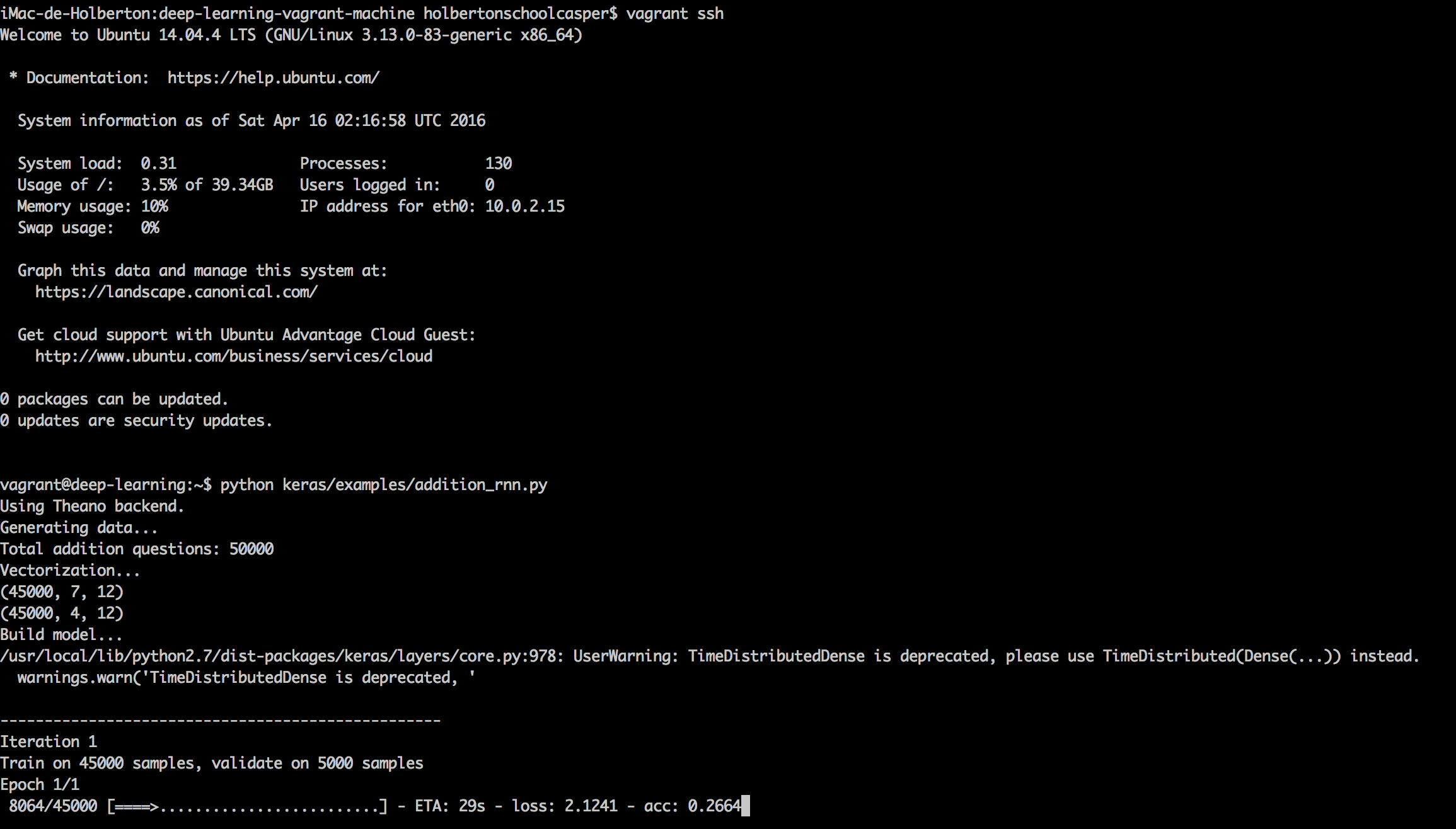 If you can see that, it means that you setup is working and that you are training your recurrent neuronnal network to perform addition!