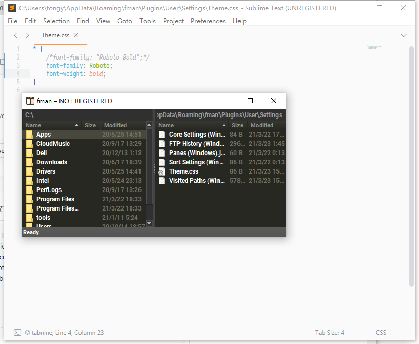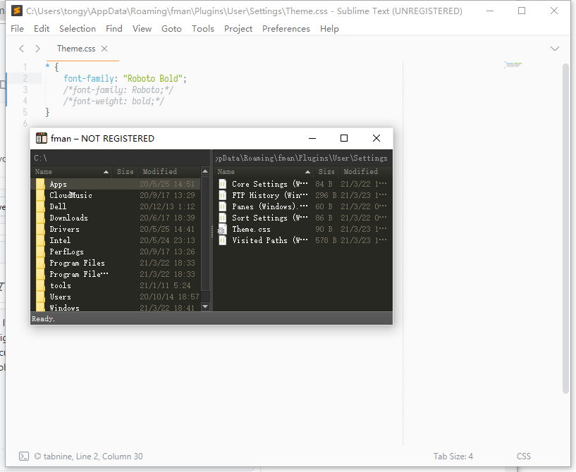 I was a MacOS user, and the default font of fman used to work fine for me. I switched to Windows lately, but the font was not loaded; instead, fman showed me a very ugly default font. I checked the original fman-users/Core repo and used the "Theme (Windows).css" as my template for custom CSS, and I found that Roboto works, whereas "Roboto Bold" doesn't (because Qt misinterprets it as the font's name, not the name and style); then I tried "font-weight: bold" with "font-family: Roboto" and achieved desired results. See images below.