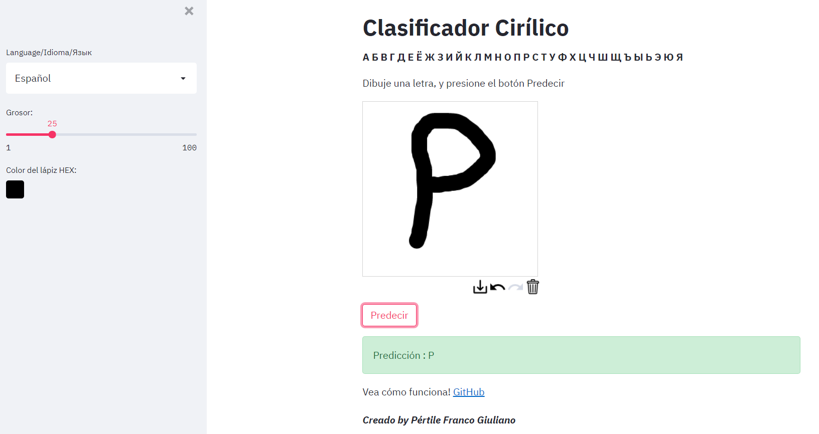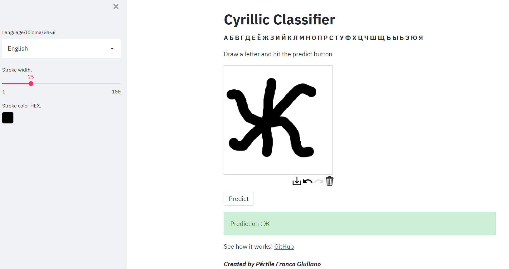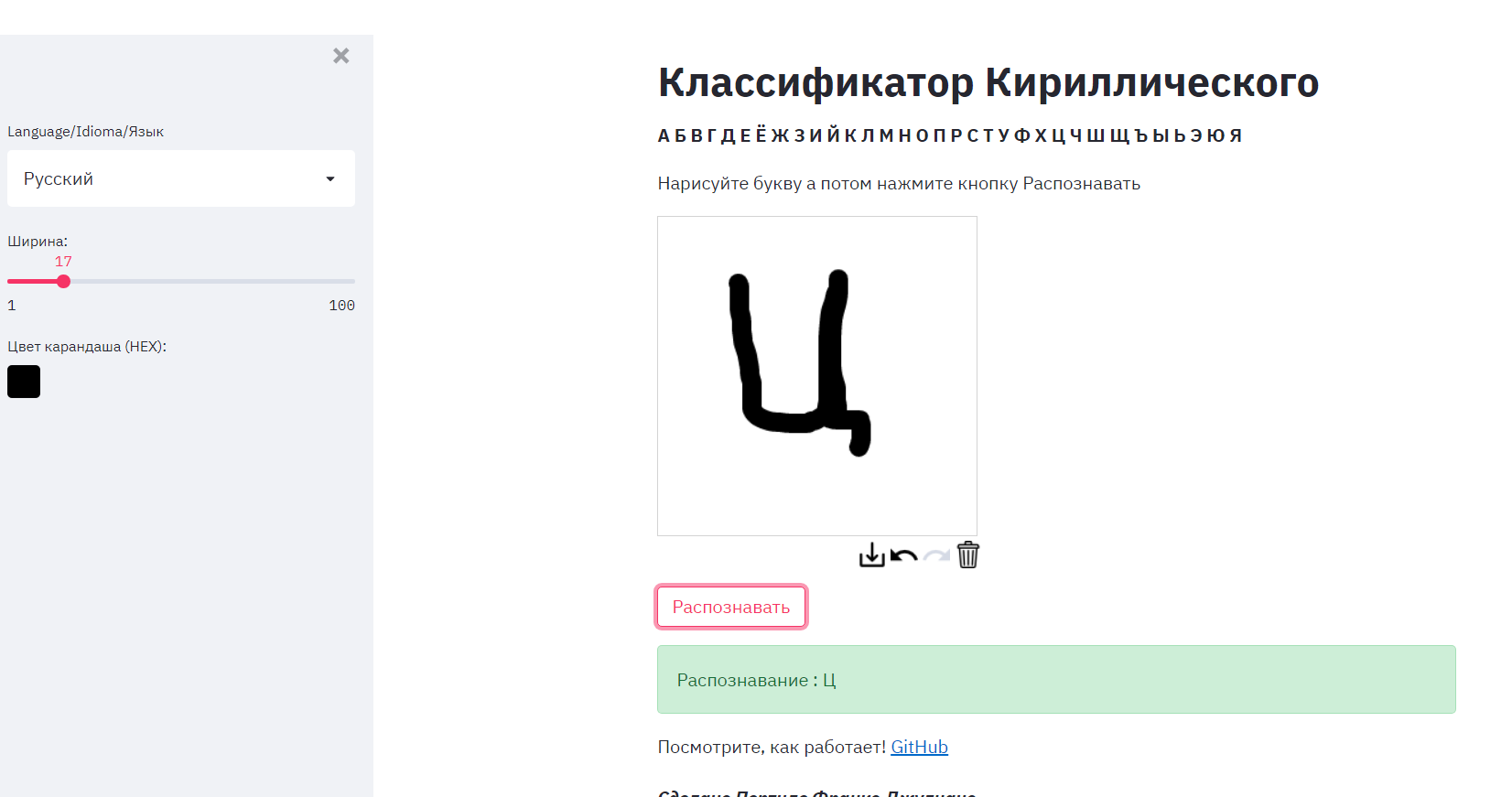 This is a web app where you can draw a letter in the russian alphabet and the ML algorithm will predict the letter that you drew.