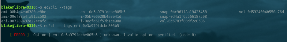 Command properly displays tags for snapshots, instances, and volumes; however, returns an error (see image) when attempting to display tags for an eni: