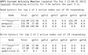 gcam (GPFS Current Activity Monitor) uses mmpmon, Python 3, and ncurses on Linux to display in a console the current GPFS read and write bytes across all currently active GPFS nodes and all GPFS file systems in a given GPFS cluster.