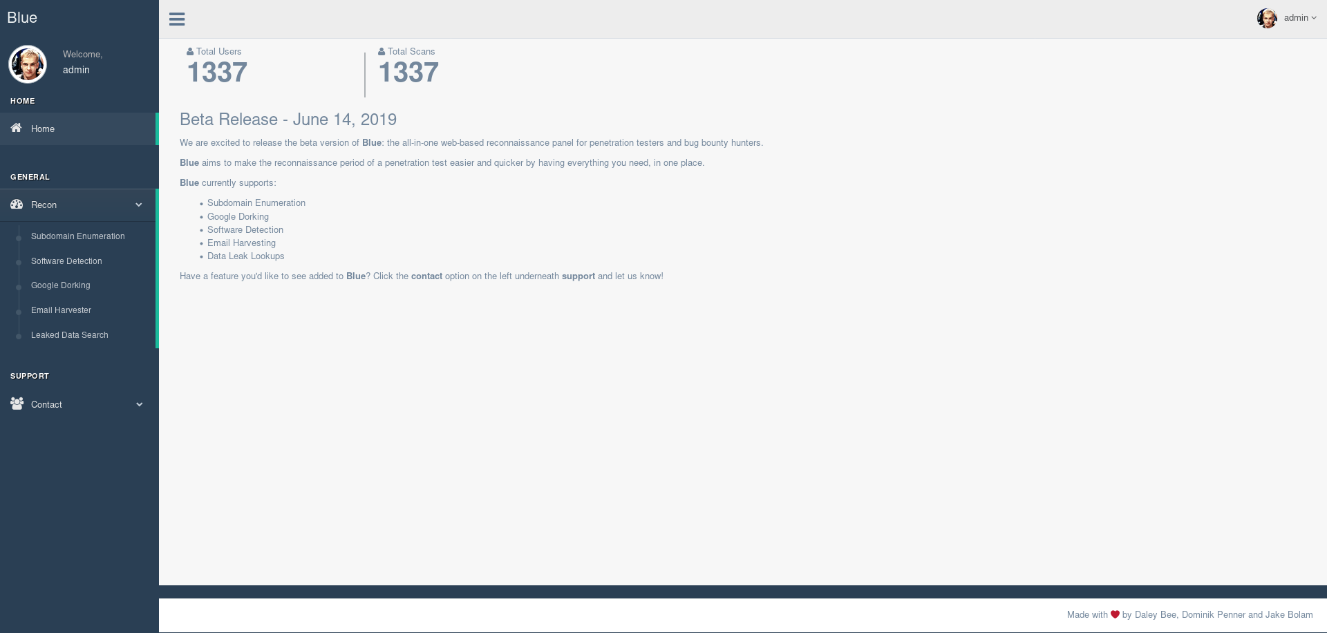Blue is a web-panel designed to make reconnaissance faster and easier accessible. Blue currently supports:
