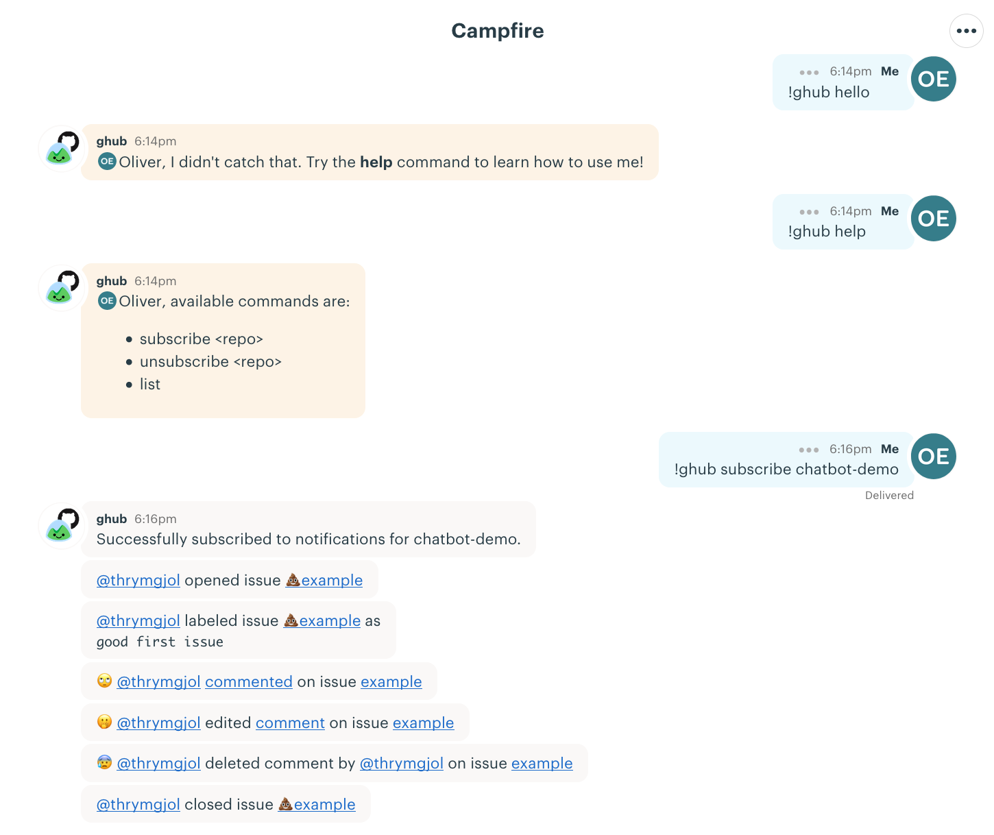 The bot has simple commands for managing the repositories subscribed to by a given Campfire. Each Campfire can subscribe to as many repositories as necessary for the team or project. You can even ping the bot for private updates.