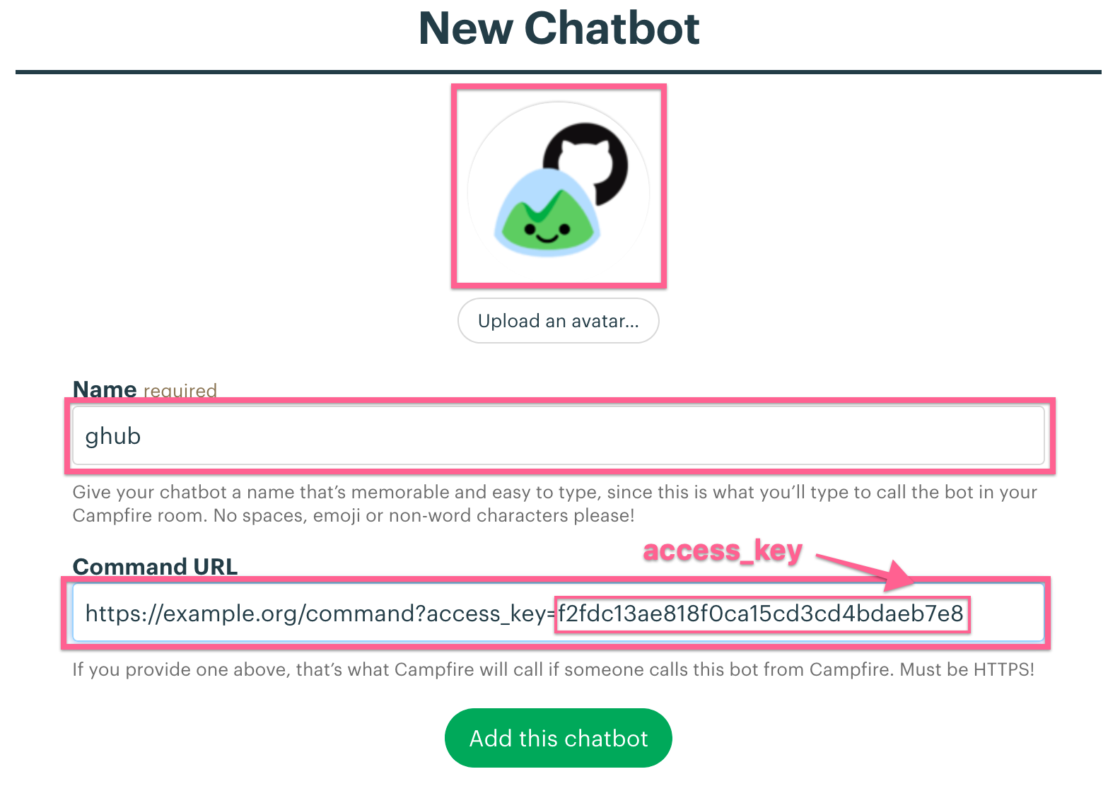 Interact with the bot by chatting !<bot-name> <command> in any campfire. Available commands are: