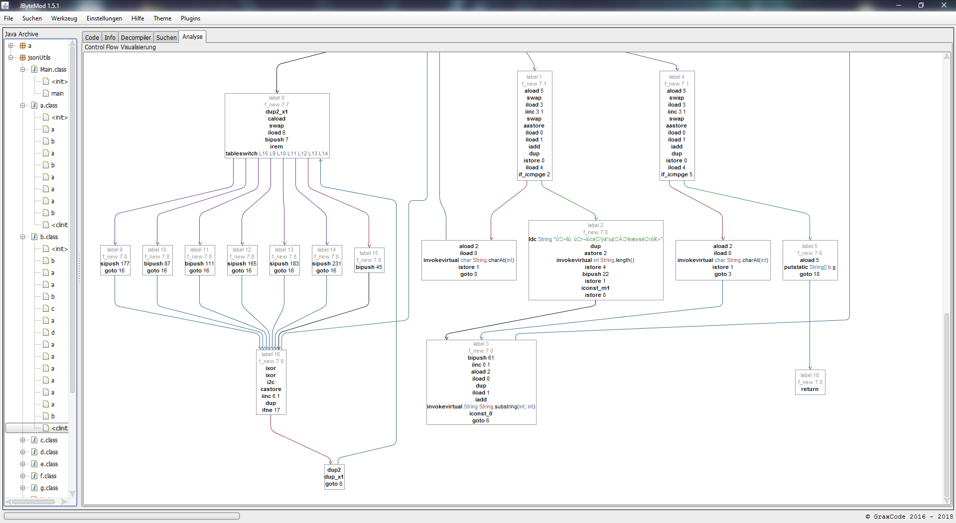 JByteMod is a multifunctional bytecode editor with syntax highlighting and live decompiling and method graphing. The successor of JByteMod: https://github.com/GraxCode/Cafebabe