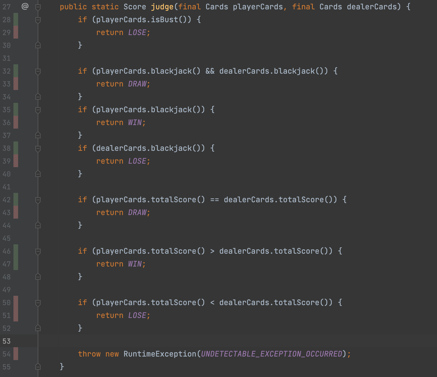 public static Score judge(final Cards playerCards, final Cards dealerCards) {
