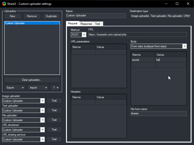Next, in destinations, set your image uploader and file uploader to "Custom image uploader"