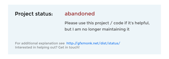 To reflect this, most issues will be tagged with wishlist - I am not planning to implement them, but I have no issue with others doing so. I'll try to fix non-wishlist issues myself (eventually), especially those tagged "bug". But please feel free to help fix those too, if you can!