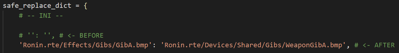 Now run convert.py again, and it should automatically fix the error for you by replacing any mention of Ronin.rte/Effects/Gibs/GibA.bmp with Ronin.rte/Devices/Shared/Gibs/WeaponGibA.bmp. The main advantages of creating a case in the dictionary - instead of manually replacing any mention of Ronin.rte/Effects/Gibs/GibA.bmp - are: