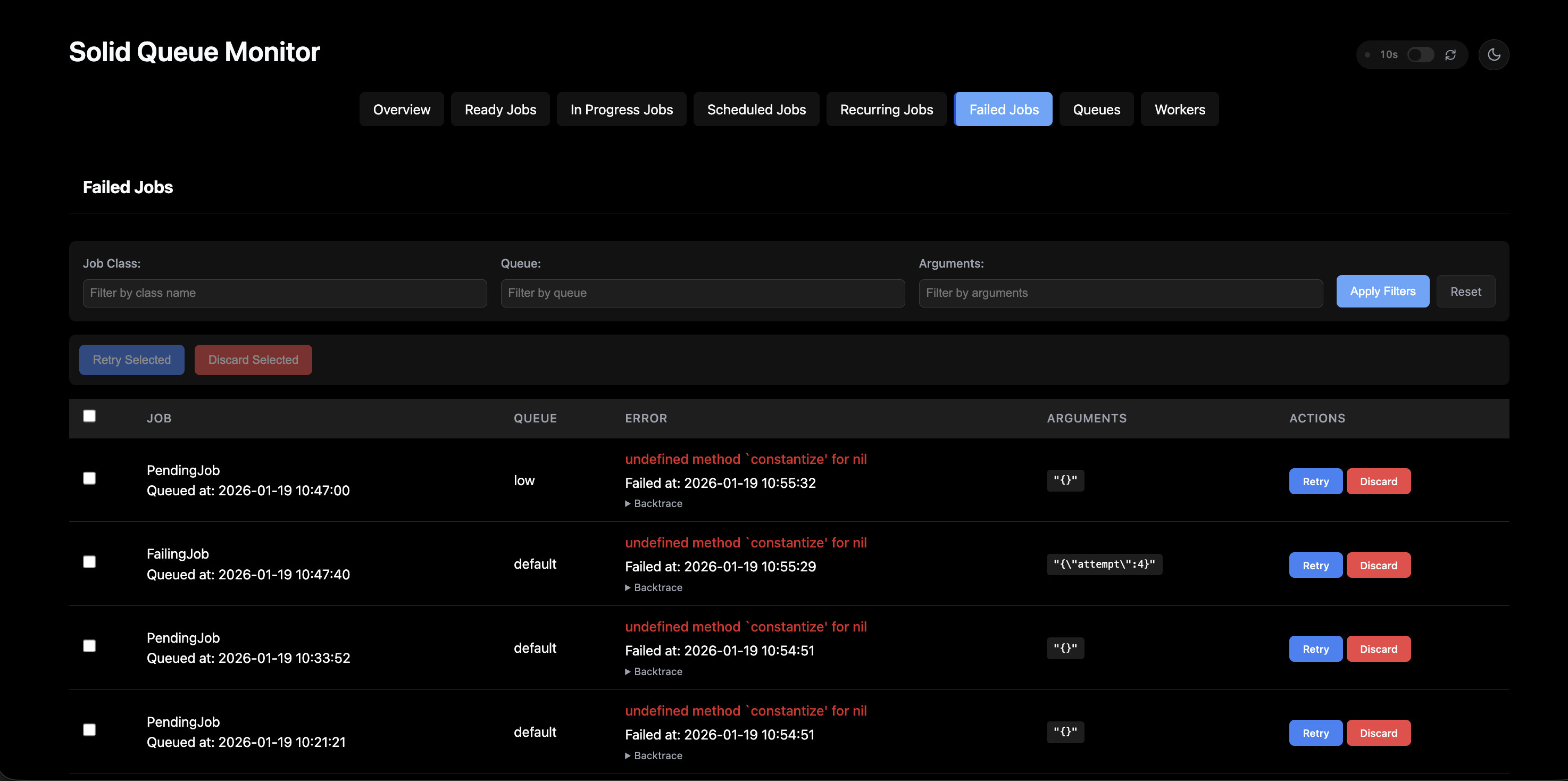 - Quick actions (retry/discard) for failed jobs