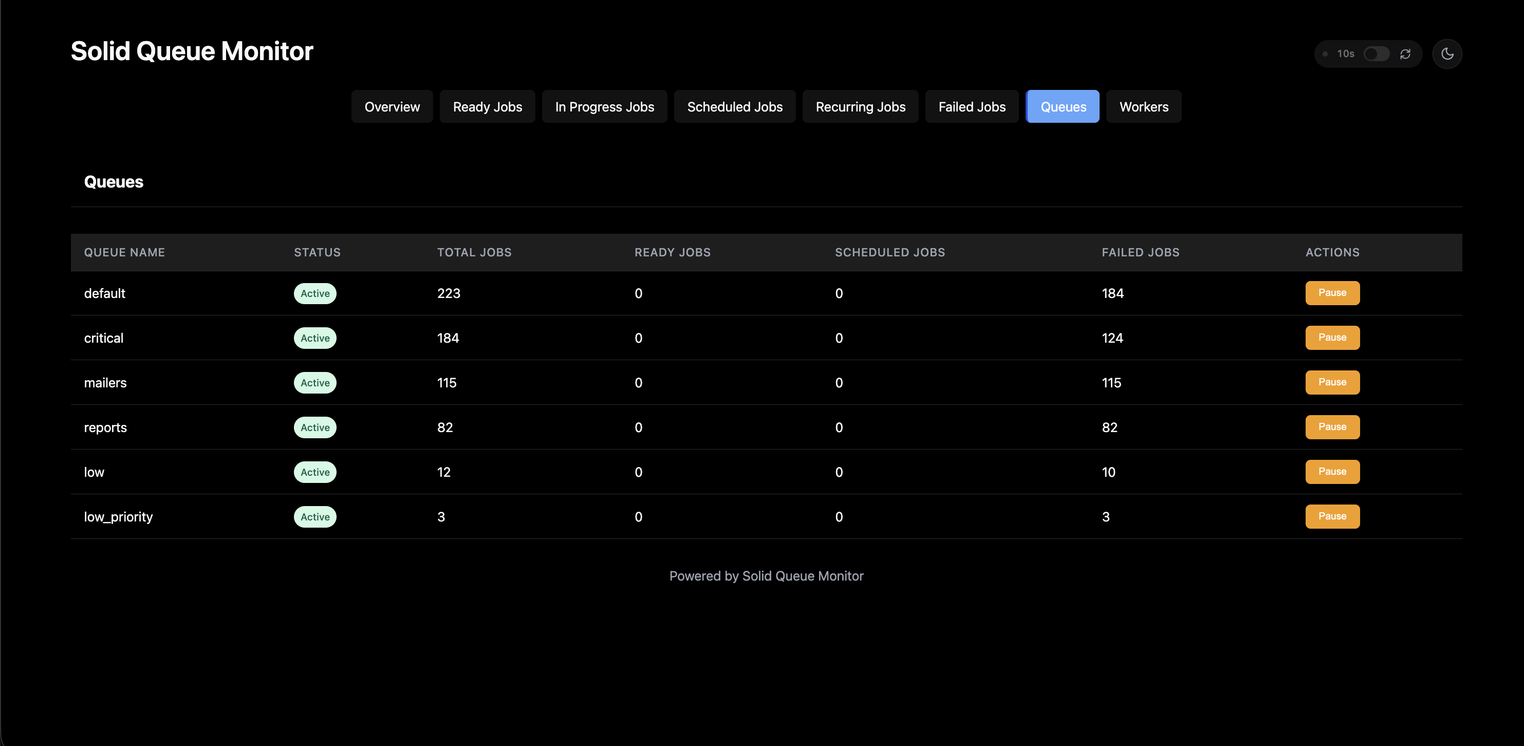 - Pause button to stop processing jobs on specific queues