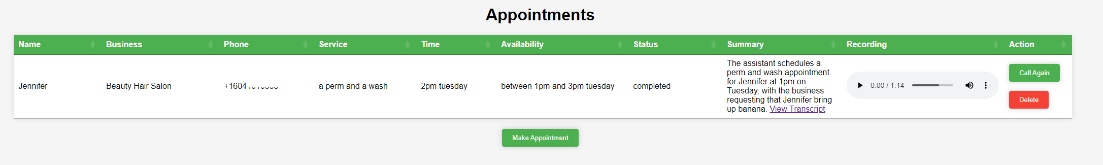 openduplex also spawns an expressjs API and a simple web interface for booking appointments, generating call summaries, listening to the call and viewing chat transcripts