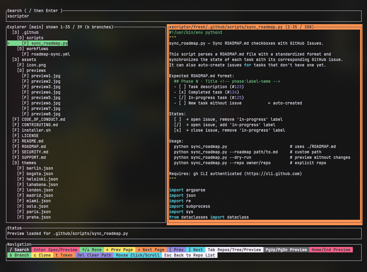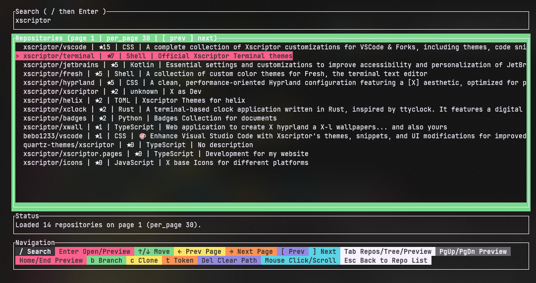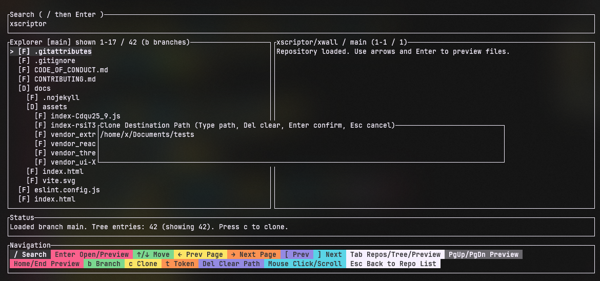 ratatui+crossterm. - GitHub API integration for search, branches, tree, file content, and auth-user validation.